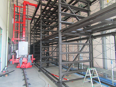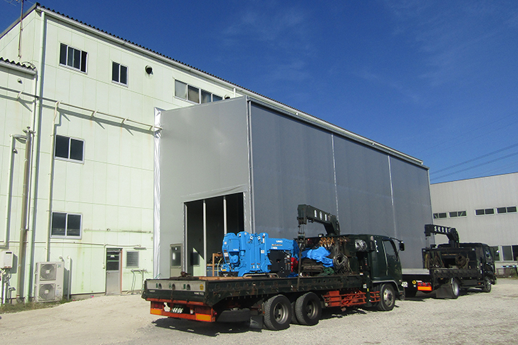 10/16、レーザー加工機導入のための拡張工事の一環として、工場外部壁面に穴を開けました。駐車場の一部を倉庫として工場の増設をします。翌週のうちに柱を建てテントを組み、来月にレーザー加工機の搬入、セッティングを行うため、自動倉庫”MARSラック”の設置を進めています。