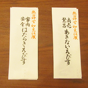 東海塗装グループでは、12社18事業所の社屋に、この「えびす札」の4種の内、商売人向けの「あきないえびす」、勤め人向けの「はたらきえびす」の2種を飾っています。