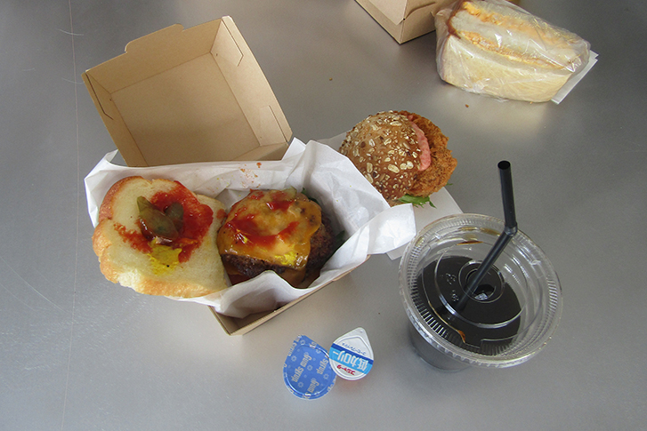 どんなパンも小麦粉100に対して水分は70~80ぐらいしか含ませることが出来ないのが常識ですが、ここの食パンは、小麦粉100に対して水分100を入れる事に成功した世界初の水分量のふんわり柔らかい食パンです。この食パンでできたワンハンドレットバーガーや、ダブルチーズバーガー、レタストマトチーズバーガーなどなど。参加スタッフ全員大絶賛。是非食パンも食べてみたいという声も多かったです。